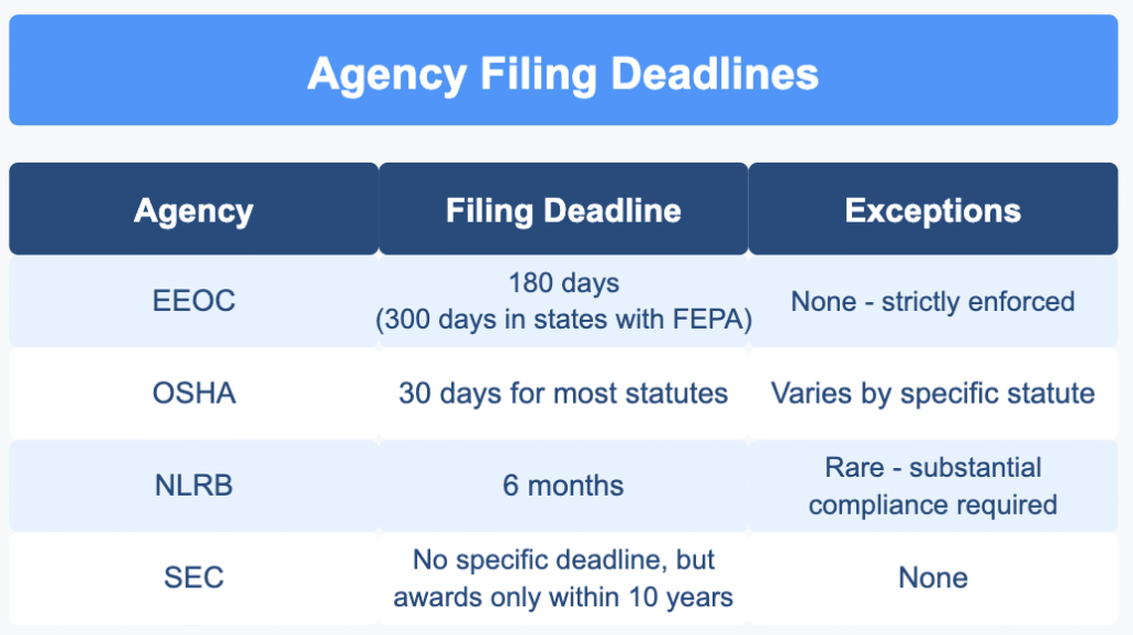 Missing a filing deadline can permanently eliminate your right to pursue a retaliation claim. These deadlines are strict and non-negotiable in most cases.